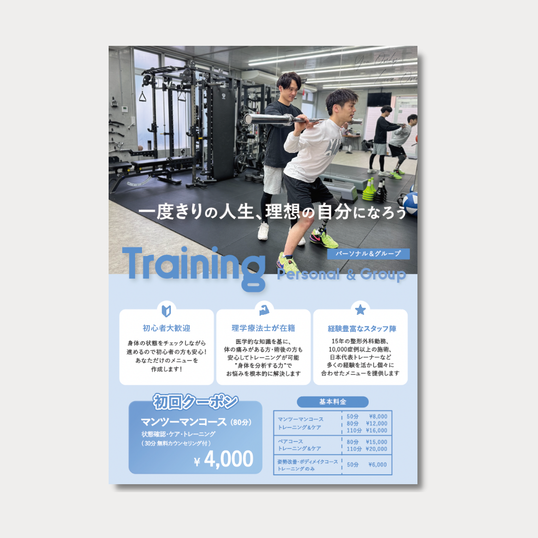千葉県市川市にあるパーソナルトレーニングジムで、オープン時にホームページ・名刺・チラシ・SNSなどトータルサポートさせていただきました。
